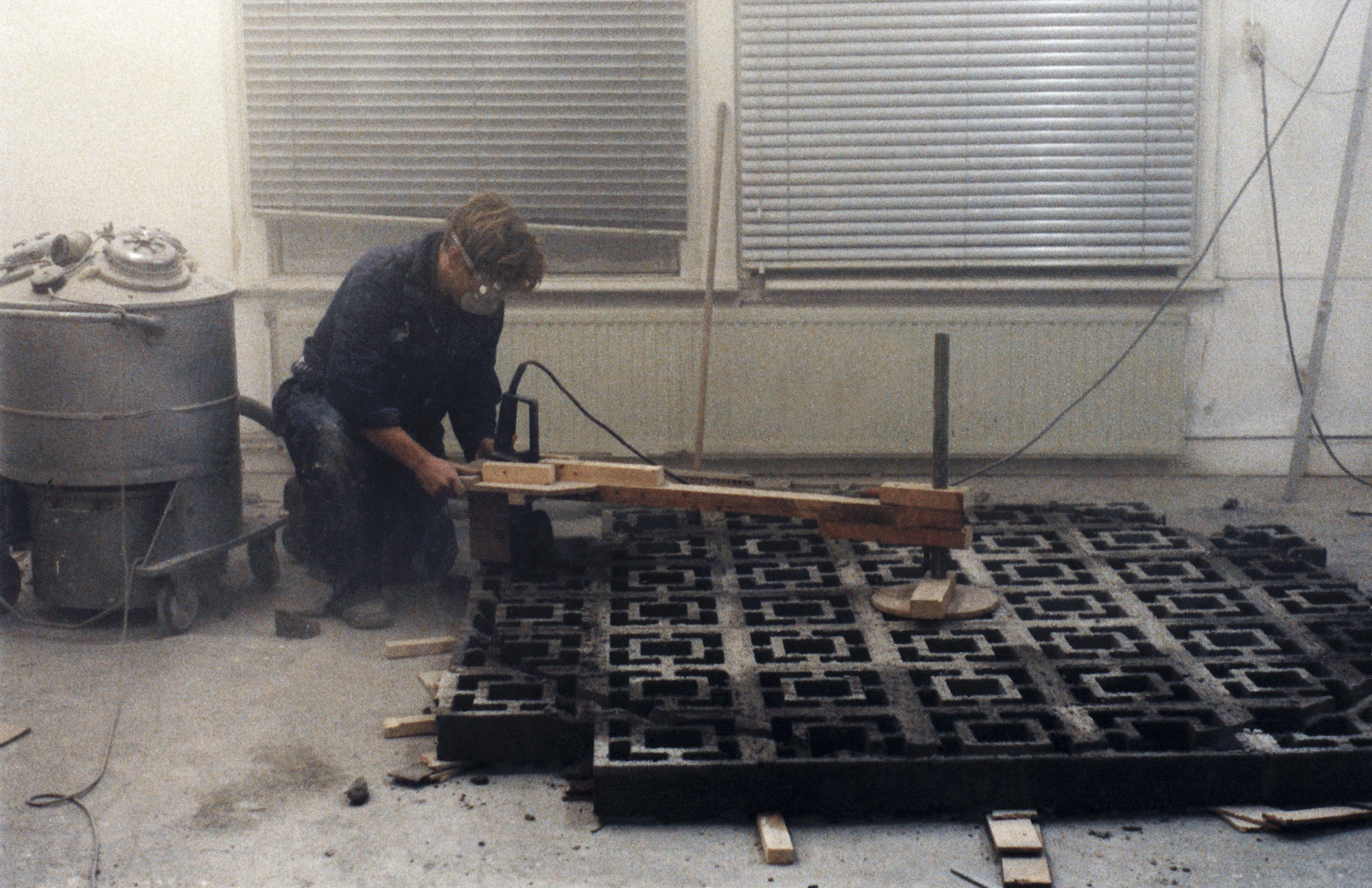 Tegen elkaar geplaatste gegoten betonnen rasters. In 1994 ben ik de documentatiefoto’s van de betonnen rasters uit 1987 gaan bewerken door ze in een rood en blauw getekende omgeving te plaatsen, waarbij de kleur van de vloer door de capillaire werking van de rasters naar boven trekt.
