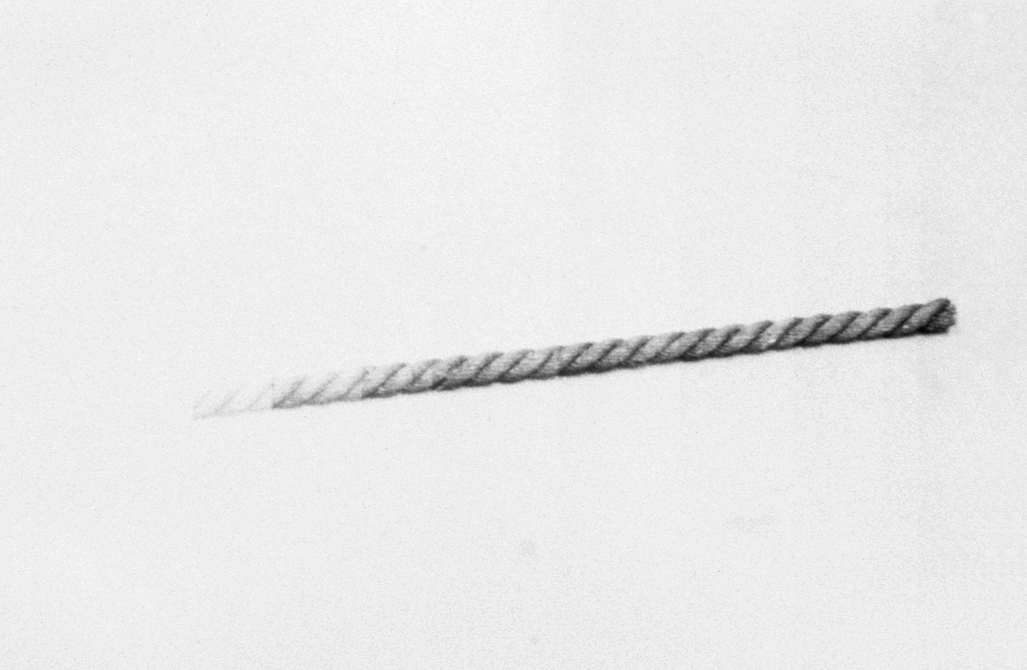 1992 Kort touwtje Zwart-witfoto ontstaan door het handmatig fotografisch afdrukken van een afbeelding van een stukje touw in 10 belichtingstijden. Het einde van het touwtje valt samen met het moment dat de belichting juist is.