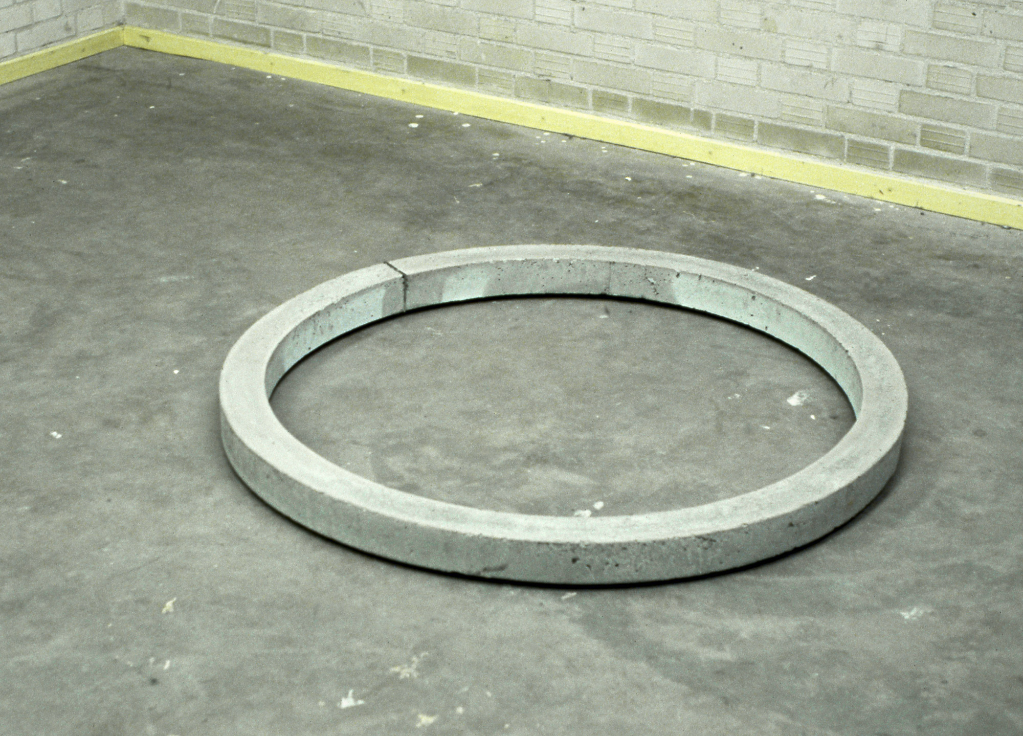 Betonnen cirkel met een vierkant spiegeltje er tussen geklemd