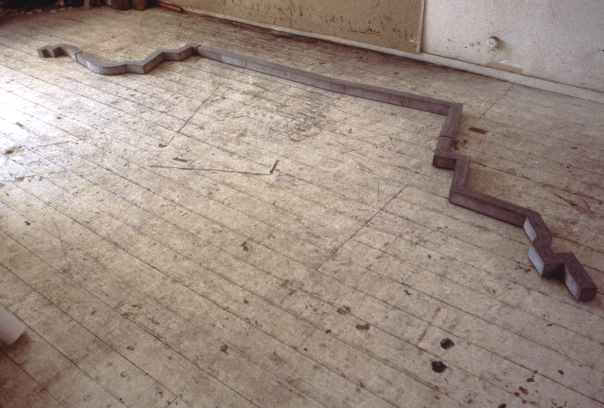 Tegen elkaar geplaatste gegoten betonnen rasters. In 1994 ben ik de documentatiefoto’s van de betonnen rasters uit 1987 gaan bewerken door ze in een rood en blauw getekende omgeving te plaatsen, waarbij de kleur van de vloer door de capillaire werking van de rasters naar boven trekt.