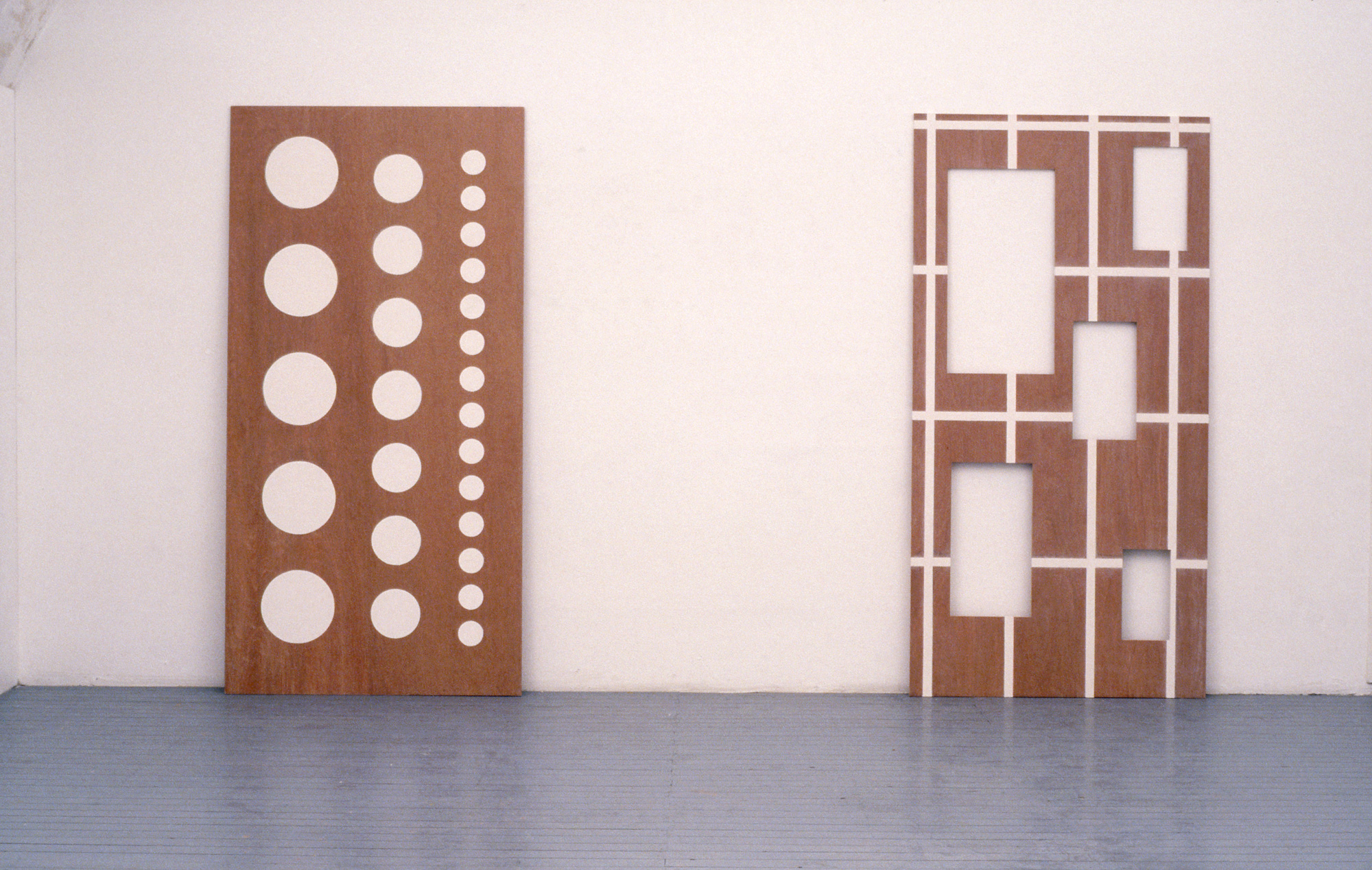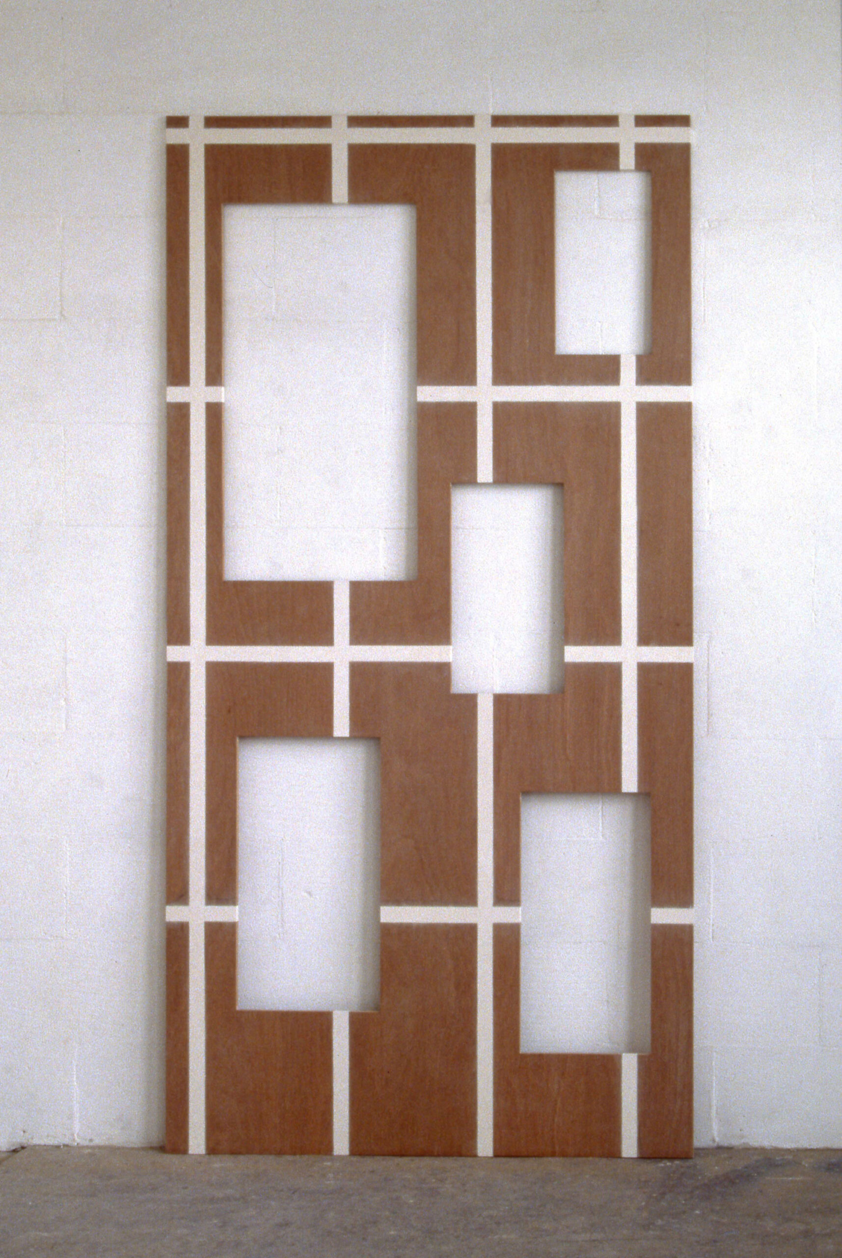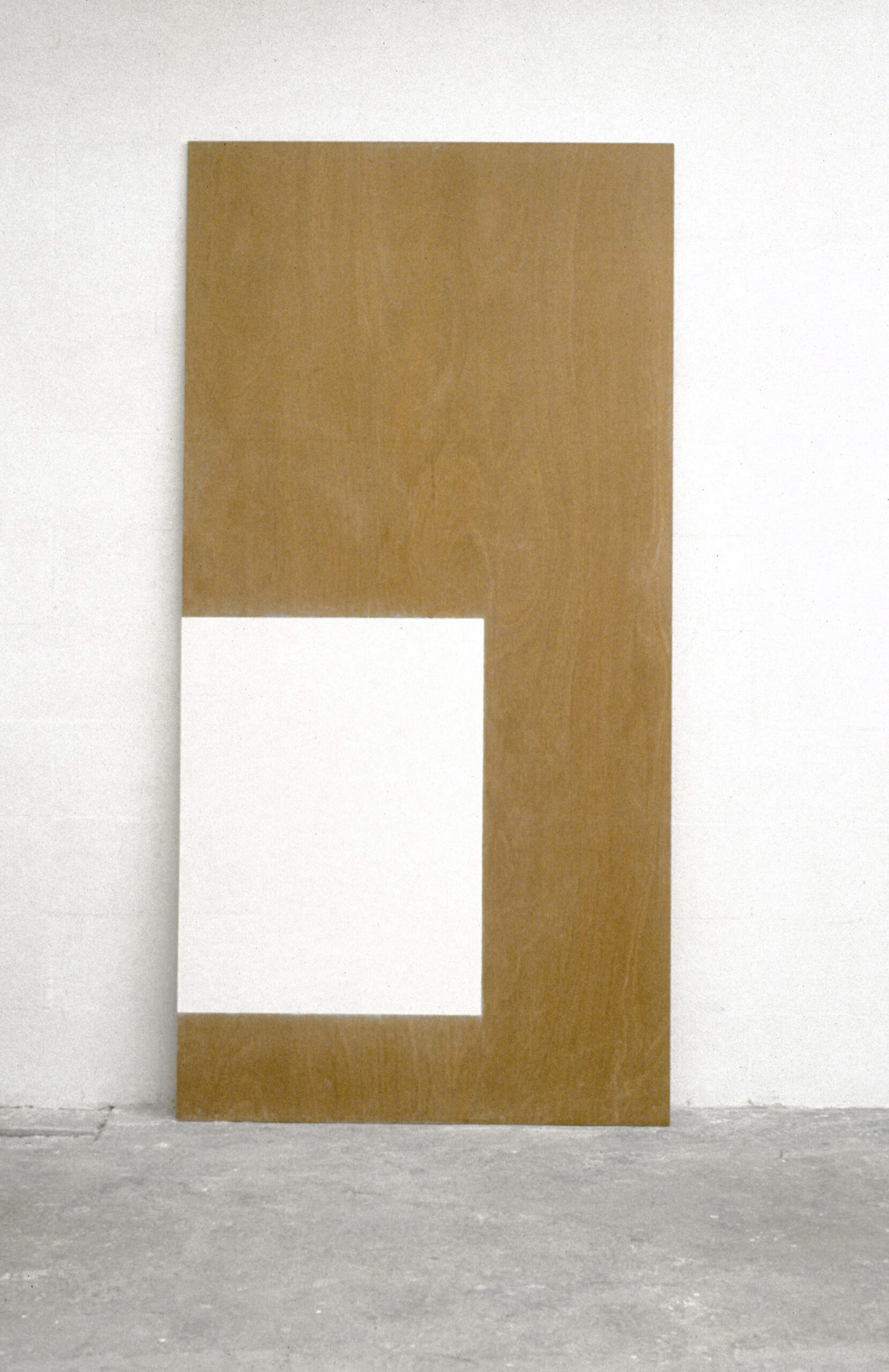 Gaten en delen van de plaat zijn opgevuld/vervangen/opnieuw samengevoegd met gegoten gips. Er ontstaan fractale beelden door te spelen met de standaard maatverhouding van de multiplex platen en het amorfe gips. Rond 1990 waren boeken als ‘Gödel, Escher, Bach’ van Hofstadter en ‘Orde uit chaos’ van Ilya Prigogine veel gelezen en populair. Geïnspireerd door die boeken, heb ik beelden gemaakt met materiaal uit de Gamma en Hubo.