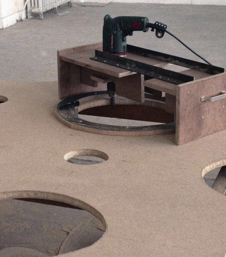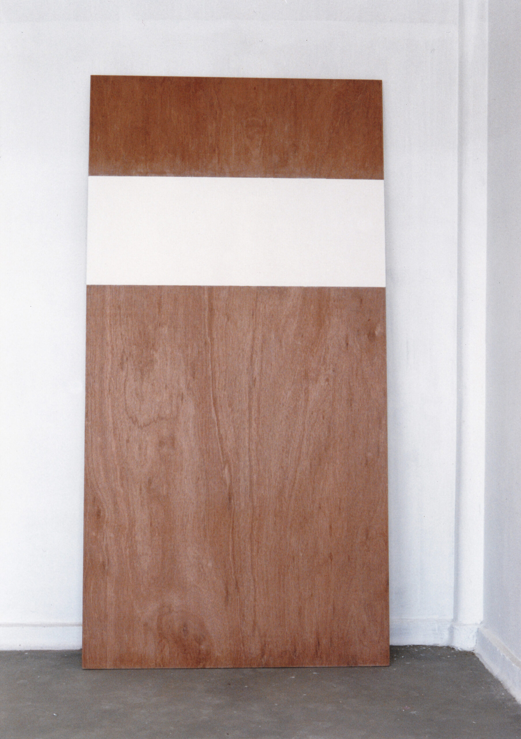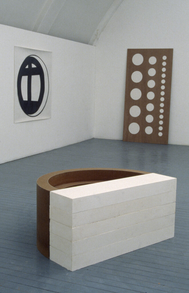Gaten en delen van de plaat zijn opgevuld/vervangen/opnieuw samengevoegd met gegoten gips. Er ontstaan fractale beelden door te spelen met de standaard maatverhouding van de multiplex platen en het amorfe gips. Rond 1990 waren boeken als ‘Gödel, Escher, Bach’ van Hofstadter en ‘Orde uit chaos’ van Ilya Prigogine veel gelezen en populair. Geïnspireerd door die boeken, heb ik beelden gemaakt met materiaal uit de Gamma en Hubo.