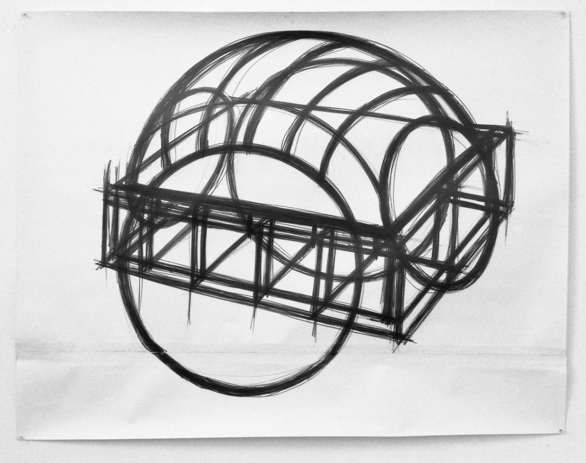 De sculptuur komt uit een reeks werken die zich allemaal op hoofdhoogte bevinden en waarbinnen ik periscopische fenomenen onderzoek. Bij dit werk kijk je achteruit. Bij een ander legt het licht een 360 graden route af via spiegels en zie je je eigen achterhoofd. Uit deze sculpturen zijn tekeningen ontstaan waarop de periscopische labyrinten zichtbaar zijn.